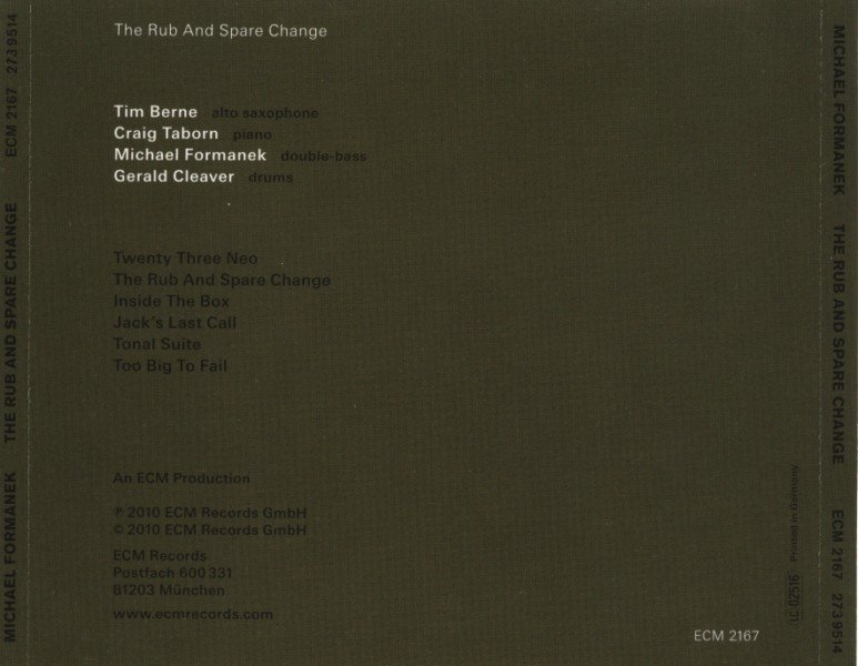 "The Rub And Spare Change” represents Formanek’s recording début for the prestigious German label ECM. It’s his first album as a leader for a dozen years and is well worth the wait. The record brings together four of New York’s most vital musicians with Formanek joined by Berne on alto saxophone, Craig Taborn at the piano and Gerald Cleaver at the drums. Something of a "supergroup” the quartet was assembled by Formanek for a performance at "The Stone” venue in New York City in 2008. Convinced that the group’s work should be documented Formanek took the quartet into the Charlestown Road Studio in Hampton New Jersey in June 2009, the fruits of their labours subsequently being mixed at New York’s Avatar Studios by ECM supremo Manfred Eicher and his assistants.